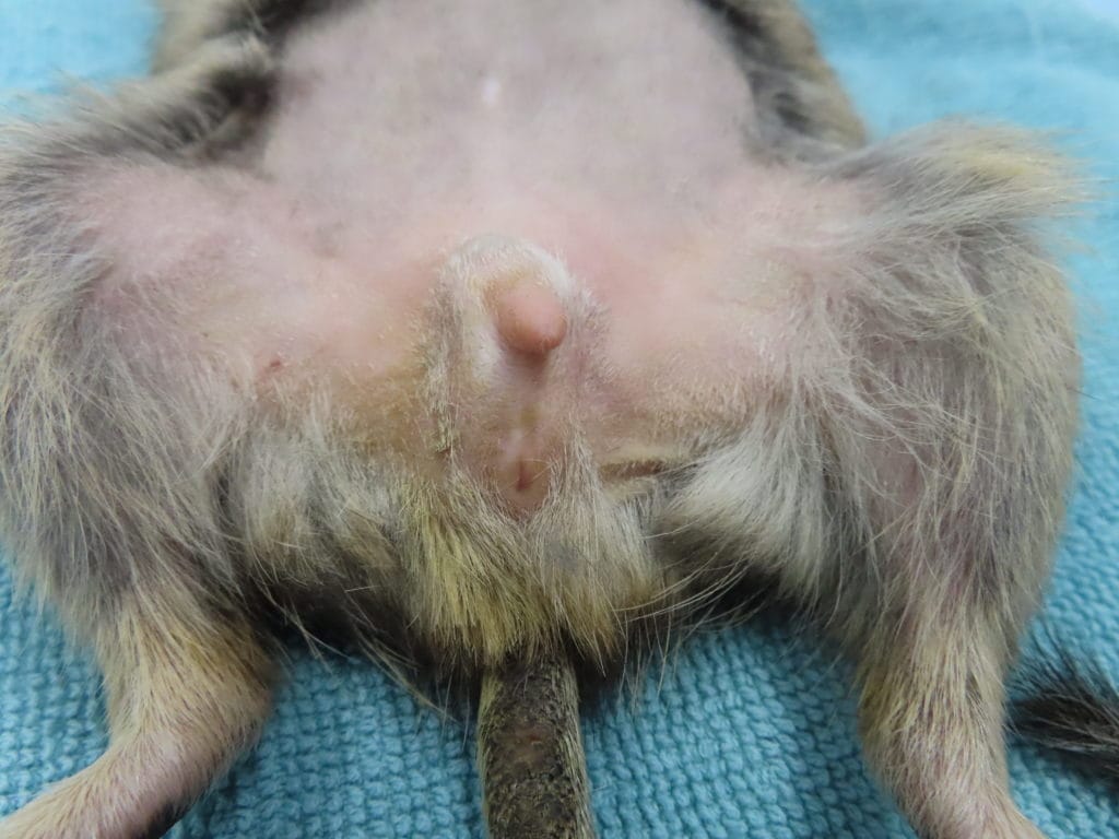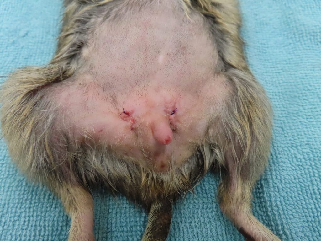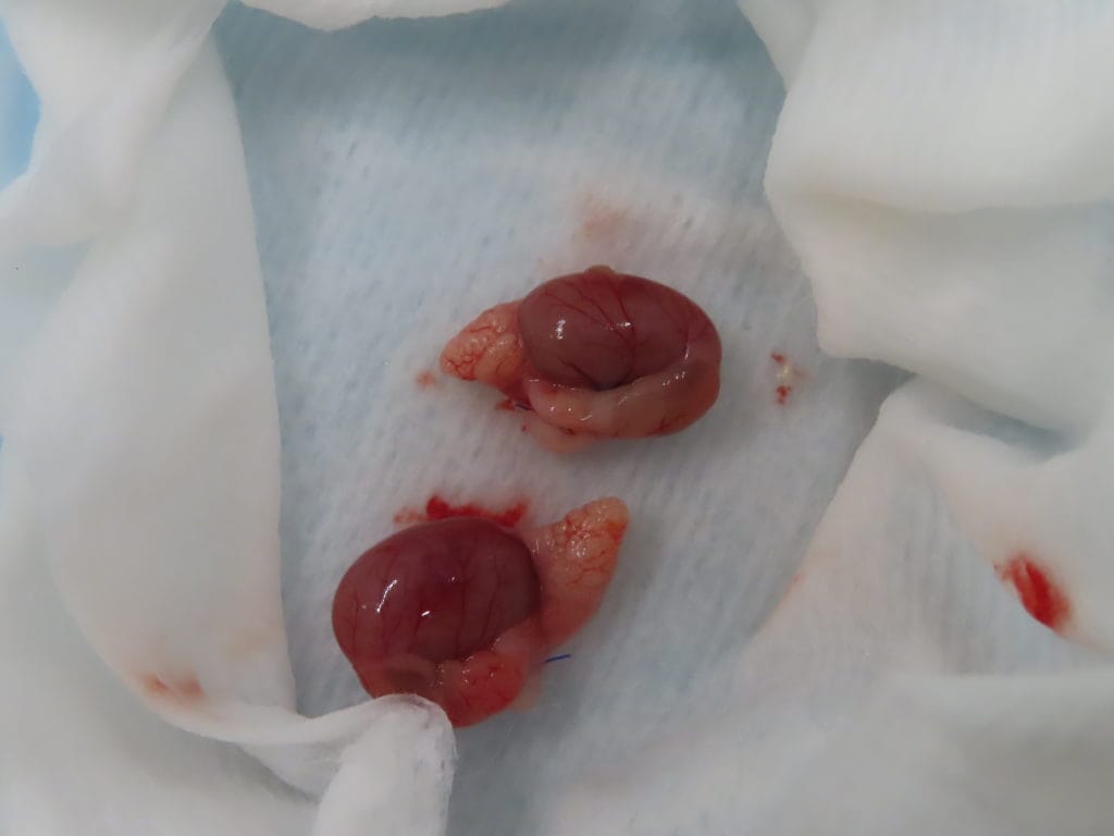 デグーの去勢② 症例紹介, デグー 2025年8月19日 デグーの去勢も最近増えてきています。以前もご紹介しましたが、デグーは明らかな陰嚢を持たないため、精巣がわかりにくいです。この子も精巣がどこにあるかわかりにくいです。わかりにくい場合は超音波検査で精巣を見つける場合があります。手術後はこのように抜糸が必要ない縫い方で縫います。日帰りです。取った精巣はこちらです。