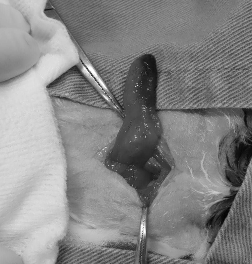 開腹するとやはり腸重積を起こしていました。ハムスターの腸重積を起こす場所は大体この場所が多いです。