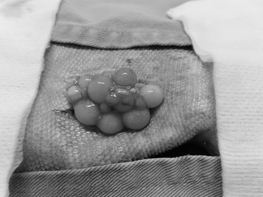 切除後の卵巣と管状のものは卵管になります。術後も特に問題なく、ごはんも食べていました。
