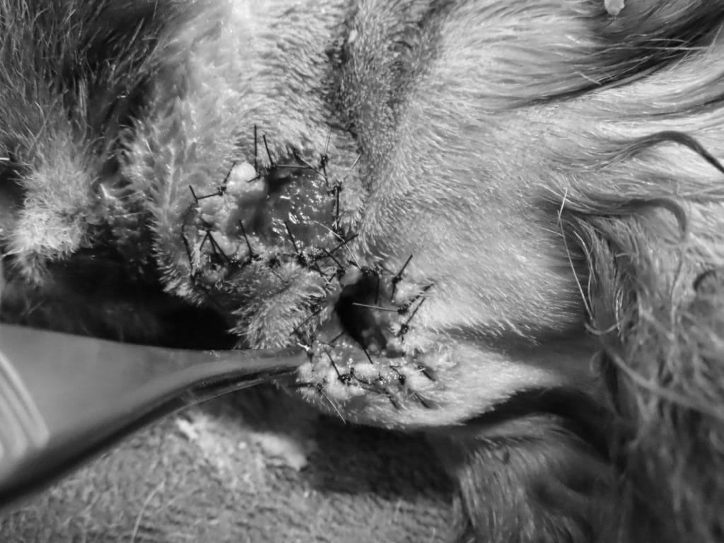 このように穴をあけます。傷が閉じないように工夫して縫合する必要があります。この子場合、何か所かに膿が溜まっていたため、2か所に穴をあけました。ここから定期的に洗浄していきます。これで細菌を落とします。見た目は少し生々しいですが、経過とともに元通りになります。