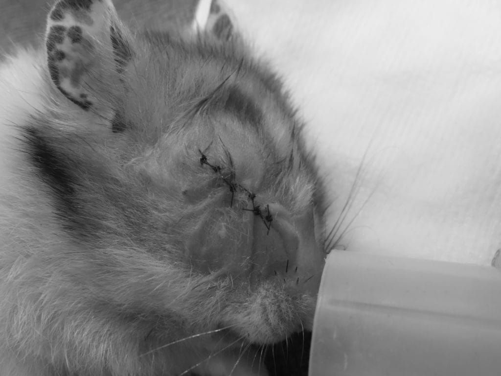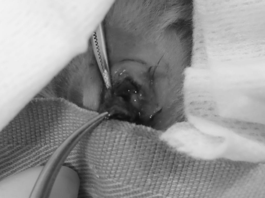膿を洗浄して取り除き、縫合しました。通常膿が溜まっている場合は眼を開けた状態にして、洗浄する場合もありますが、今回は膿の量がそこまでではなかったため、閉じました。