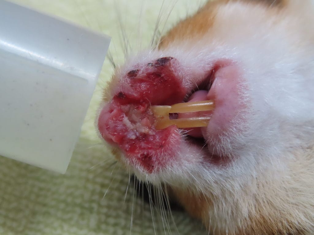 ハムスターの口唇の扁平上皮癌 症例紹介, ハムスター 2026年2月22日 この子は口唇に傷があり、他院にて治療しましたが、よくならず、当院に紹介来院されました。このように口唇に広範囲の外傷が認められます。あまり治らない傷などは腫瘍の可能性があります。そのため、一部を採材に病理組織検査に提出しました。結果は「扁平上皮癌」という悪性腫瘍でした。扁平上皮癌は明らかな腫瘍の形を取らず、このように傷として広がっていく場合もあります。慢性炎症などから腫瘍化することもあります。この子はできた場所が悪く、手術をして取り除くことはできないため、投薬治療をしていきます。