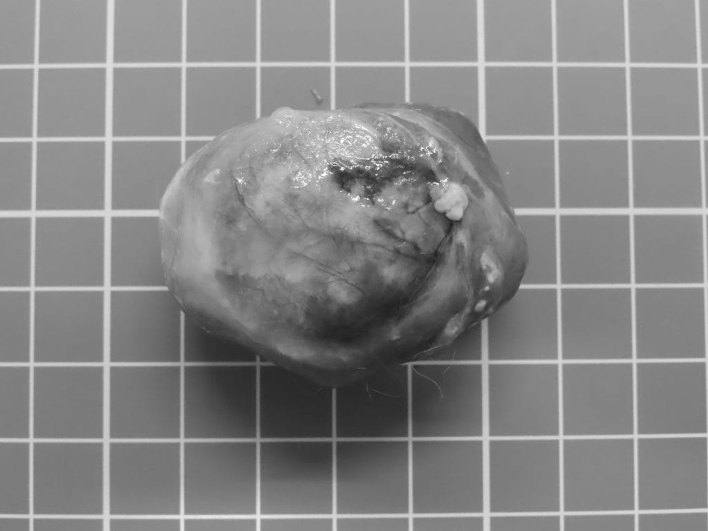 病理検査結果は腺癌でした。経過観察では再発は見られませんでしたが、悪性の腫瘍のため、今後も経過観察が必要です。