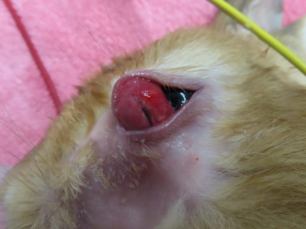 この子も2歳くらいですが、左の瞬膜腺が異常に腫れてしまい、涙などで目回りも荒れてしまっていました。